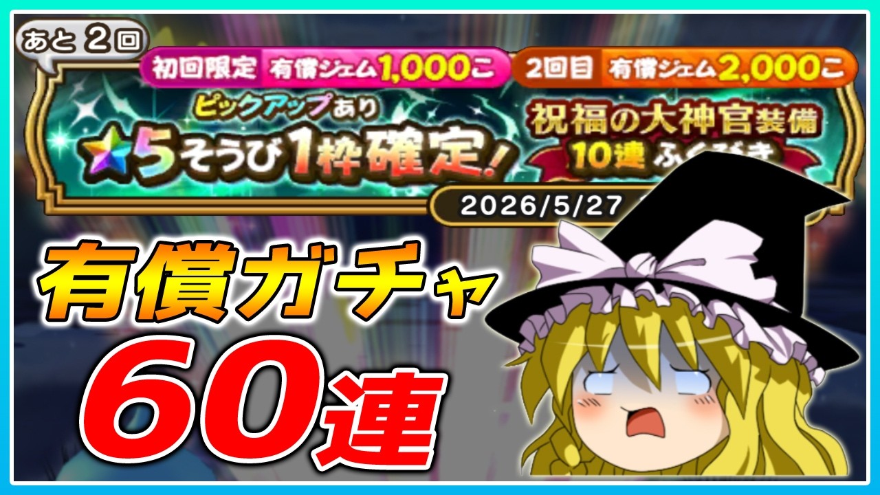 イベント終了間際に大神官装備の有償ふくびき60連に挑戦してるんだ!爆死覚悟のチャレンジだけど、結果がどうなるかドキドキするよね!みんなもガチャを引くか迷ってたら、ボクと一緒にこの動画で運試しを見てみてほしいんだ!